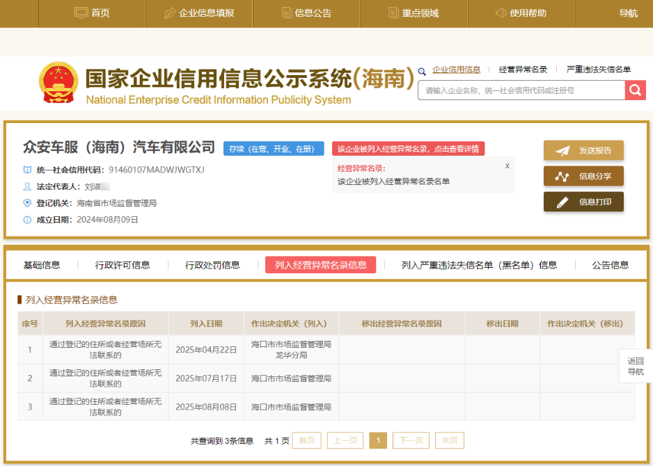 国家企业信用信息公示系统(海南)显示,众安车服(海南)汽车有限公司今年以来已3次被列入经营异常名录。
