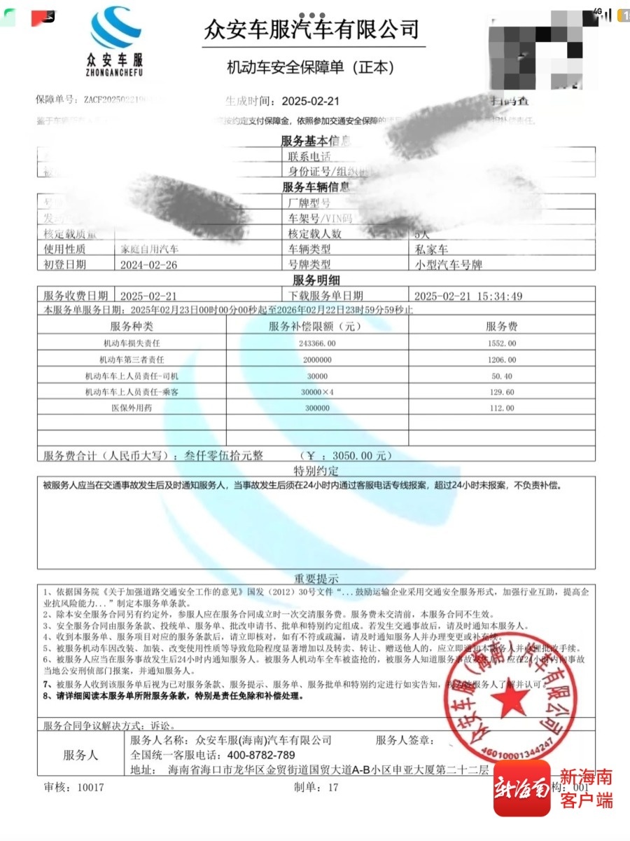 众安车服(海南)汽车有限公司向车主出具的所谓保单实为“机动车安全保障单”。受访者公供图