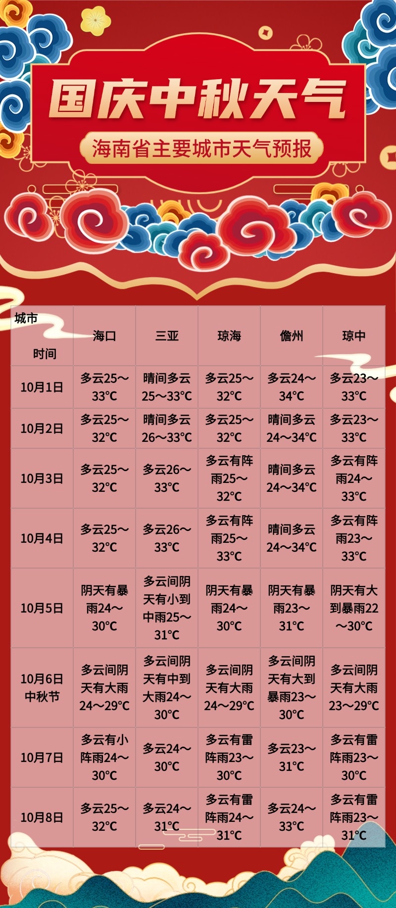 国庆中秋假日大部分时段天气晴好!海南未来几天天气→