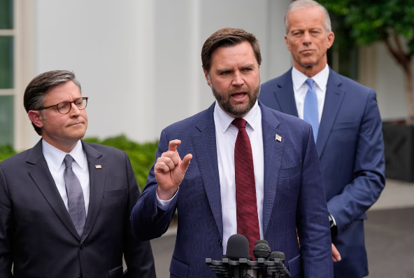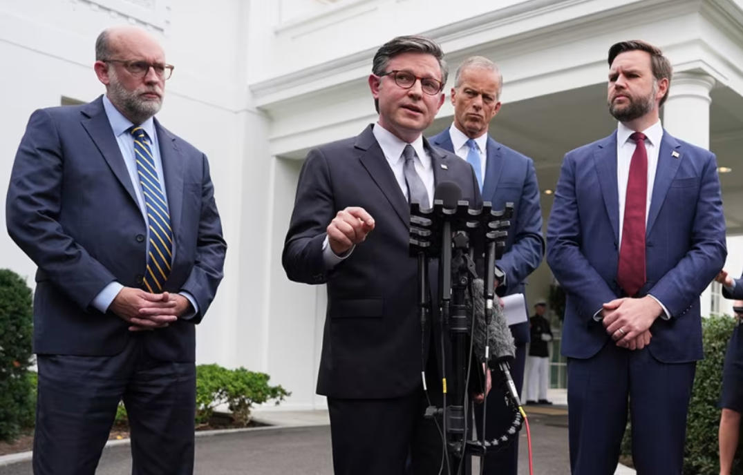 △美国副总统、共和党人万斯(右1)与美国众议院议长、共和党人麦克·约翰逊(左2)