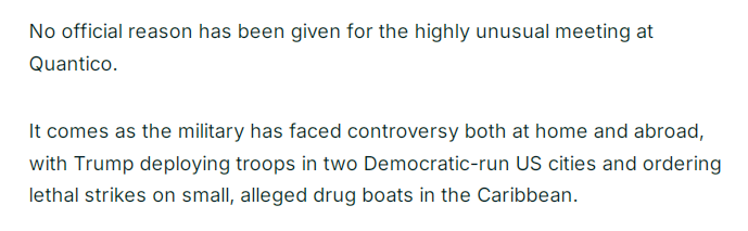 法新社的报道说,这场会议极不寻常,五角大楼至今未给出正式解释。当前美军正深陷国内外争议:特朗普不仅向两个民主党主政城市部署军队,还下令对加勒比海域疑似“贩毒”的小型船只实施致命打击。
