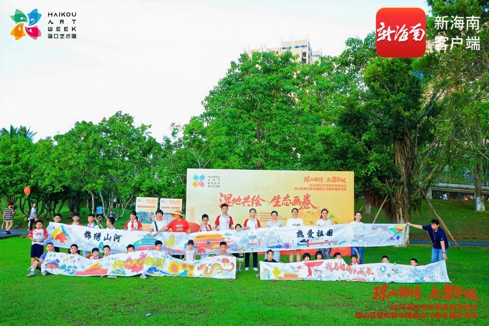 活动开场,“湿地共绘・生态画卷”率先登场。社会各界的参与者在专业老师的指导下,围绕“红色历程”与“生态琼山”双主题展开集体创作长卷。长卷分设两大区域,分别再现革命岁月红色印记与美舍河湿地绿色风光,参与者以色彩抒发爱国情怀、传递生态保护理念。傍晚时分,两幅主题长卷完成,创作者与作品合影留念,该长卷将成为文化周珍贵纪念。