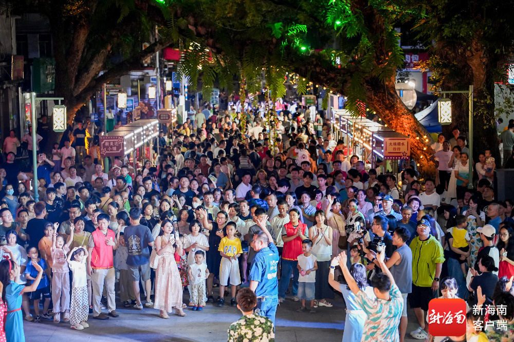 同时,街区的演出内容也极为丰富多元,既有80年代金曲舞蹈,也有经典影视音乐串烧。同时,巧妙融入黎族竹木器乐、黎锦苗绣等国家级非物质文化遗产展示,通过移动舞台的活态呈现,实现了民族风情与怀旧氛围的深度交融。