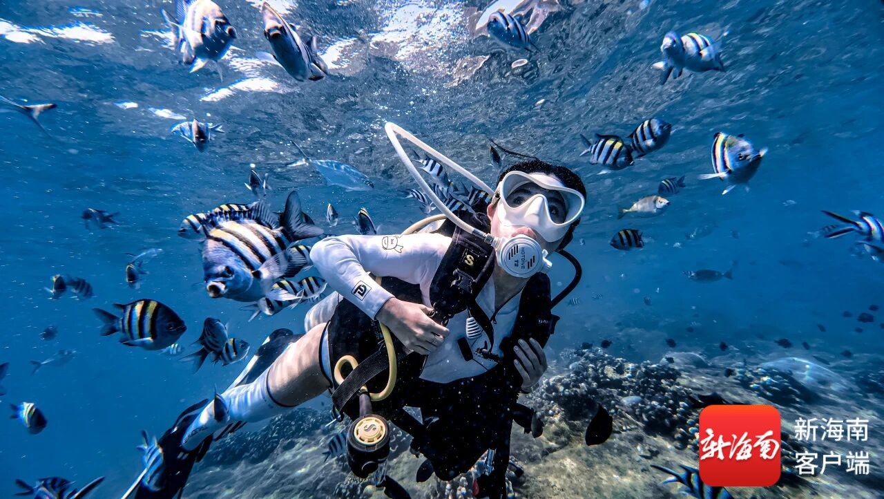 游客在蜈支洲岛潜水邂逅热带鱼群。通讯员 陈宏 供图