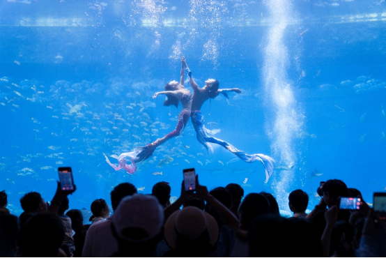 为增添节日氛围,水族馆特别推出国风主题水下人鱼表演。身着汉服的美人鱼演员将在11米深的大使环礁湖上演“水中洛神”,以优美的舞姿和灵动的表演,展现中国传统美学与海洋世界的奇妙融合。