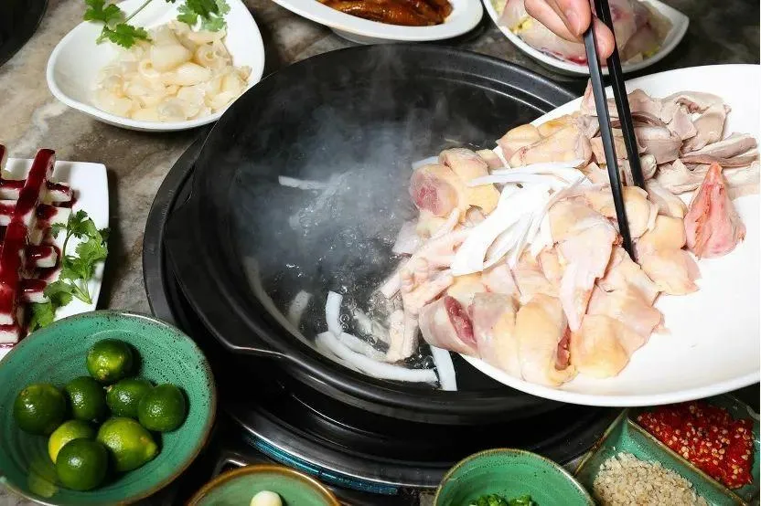 当着客人的面,服务员麻利地将3个新鲜椰子划开,椰汁倒入锅中,一股沁人心脾的清甜弥漫开来。待汤底煮沸,再将一盘皮薄肉嫩的文昌鸡块滑入锅中。无需复杂的调料,没有漫长的等待,计时沙漏翻转三五分钟后,一锅的鲜甜可口便让老饕食指大动。