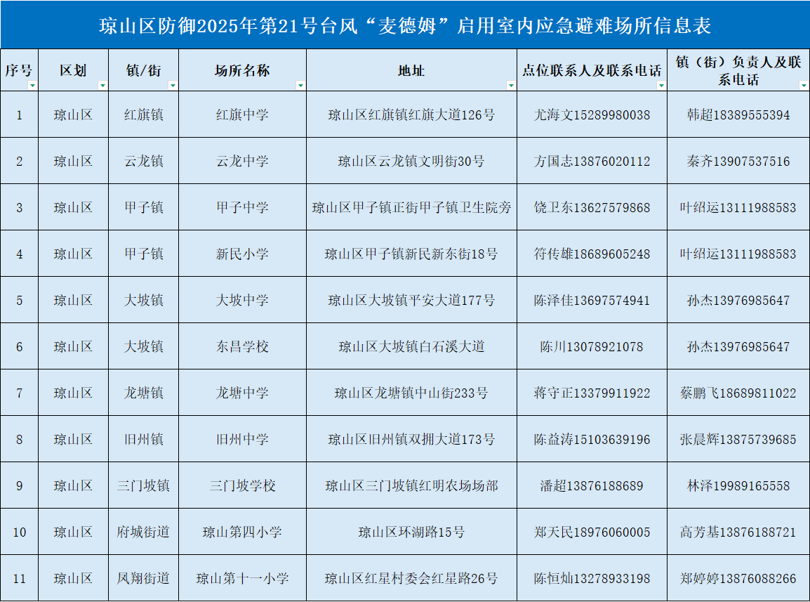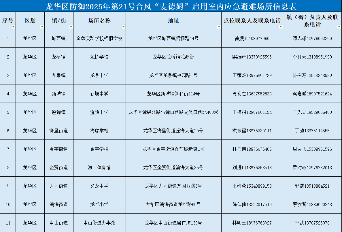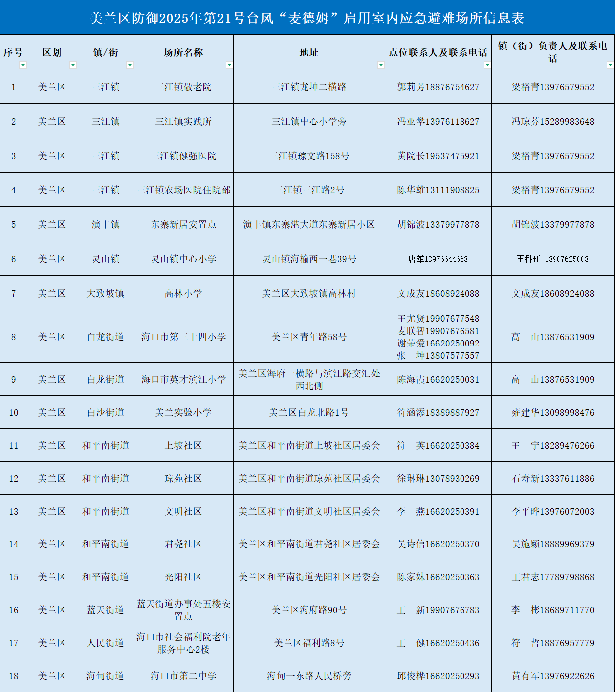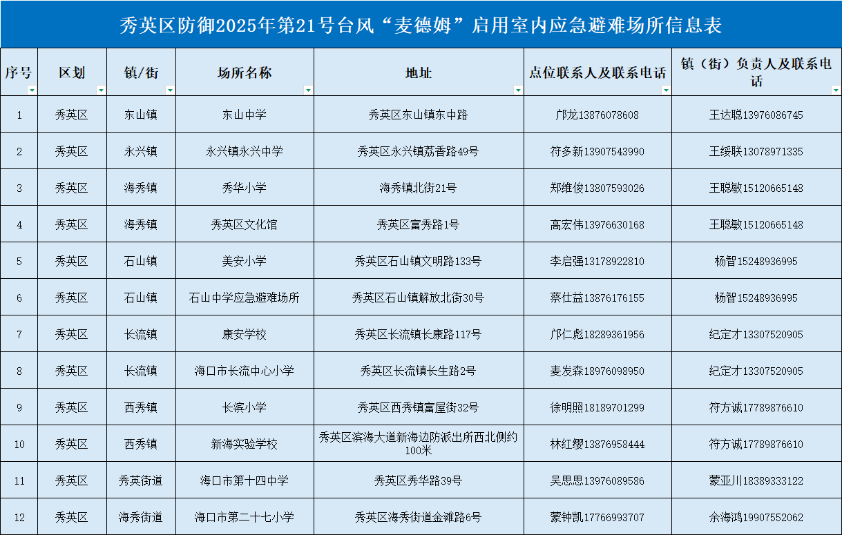 南海网、新海南客户端10月4日消息(记者 王燕珍)注意!今年第21号台风“麦德姆”来势汹汹,直奔琼粤沿海,10月4日,海口市应急管理局将海口市各区应急避难场所信息公布如下,快来看看哪个离您最近。心中有数,应急不慌。