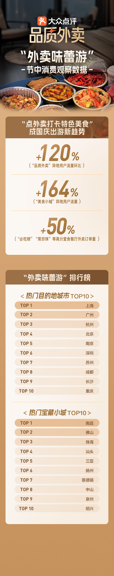 10月4日,大众点评“品质外卖”发布“外卖味蕾游”节中消费观察数据。假期前三天,“品质外卖”异地用户流量环比上月增幅超120%,其中二三四线美食小城流量增幅远超大盘,达到164%;“必吃榜”“黑珍珠”等高分堂食餐厅外卖订单量同比涨超50%,平均客单价为42.5元,“堂食+外卖”齐发力推动假期餐饮消费增长;上海、广州、杭州、北京、南京、深圳、苏州、成都、长沙、重庆为“外卖味蕾游”TOP10热门城市,南昌、佛山、珠海、汕头、三亚、扬州、景德镇、中山、泉州、绍兴为“外卖味蕾游”TOP10美食小城。