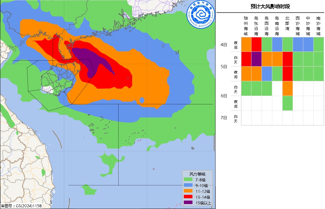 北部湾北部海面,4日夜间和6日下午~8日,风力5~6级、雷雨时阵风7~8级;5日~6日上午,风力9~11级、阵风12~14级。