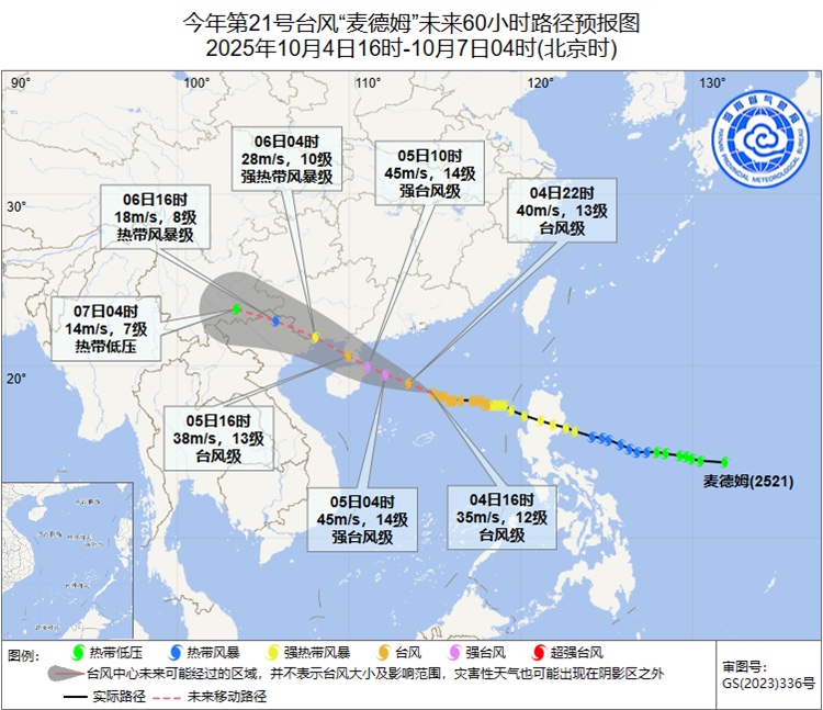 受台风“麦德姆”影响,10月4日夜间~5日,南海中部和北部的大部分海域风力11~13级、阵风14~15级,其中“麦德姆”中心经过的附近海面旋转风可达13~15级、阵风15~17级;海南岛北半部地区有强风雨天气,海南岛东部海面和琼州海峡风力逐渐增大到11~13级、阵风14~15级;海口、文昌、定安、澄迈、临高、儋州、白沙和昌江等市县累积雨量200~300毫米、局地450毫米。台风“麦德姆”十级风圈于4日下半夜起影响北半部市县,十二级风圈5日早晨起影响文昌、海口、澄迈,请相关市县加强人员安全管理。