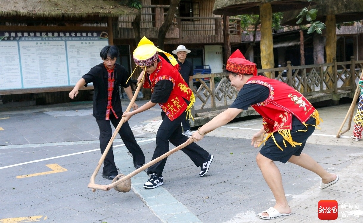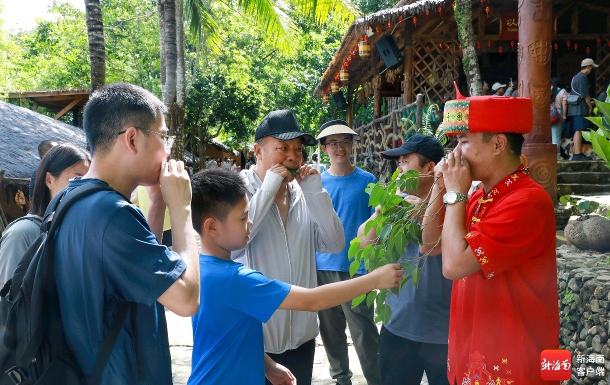 在甘什抄体验区,这里更是成为游客感受非遗的“宝藏之地”。文化展馆内,一件件承载历史记忆的展品,诉说着黎族苗族民族的古老典故;周边的古老村落里,悠扬的民族歌谣随风飘荡,让人仿佛穿越时空。“看非遗、赏风情”,成为这个国庆假期游客打卡槟榔谷的优先选择。儋州调声的婉转悠扬、钻木取火的原始神奇、竹木器乐演奏的清脆悦耳、吹叶笛的自然灵动、黎锦织绣的精美绝伦……多项非遗技艺轮番展示,让游客沉浸式感受非遗的独特魅力,收获极佳的游览体验。