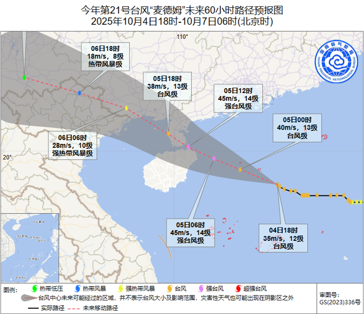 预计,“麦德姆”将以每小时25~30公里的速度向西偏北方向移动,并逐渐向海南岛东北部到广东西部一带沿海靠近,强度逐渐增强,最强可达强台风级(14~15级,42~48米/秒),将于5日上午在文昌登陆或近海擦过(强台风级,14~15级,42~48米/秒),登陆后强度逐渐减弱。