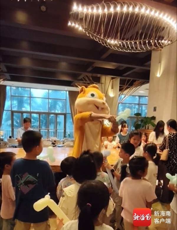 走进酒店大堂,一场别开生面的松鼠部落活动正在火热进行中。酒店员工们身着可爱的松鼠服装,化身为萌萌的“松鼠使者”,与亲子游客们欢乐互动。他们一会儿带着孩子们做游戏,一会儿教孩子们折气球,现场气氛十分活跃。孩子们围在“松鼠使者”身边,不时发出阵阵欢快的笑声。