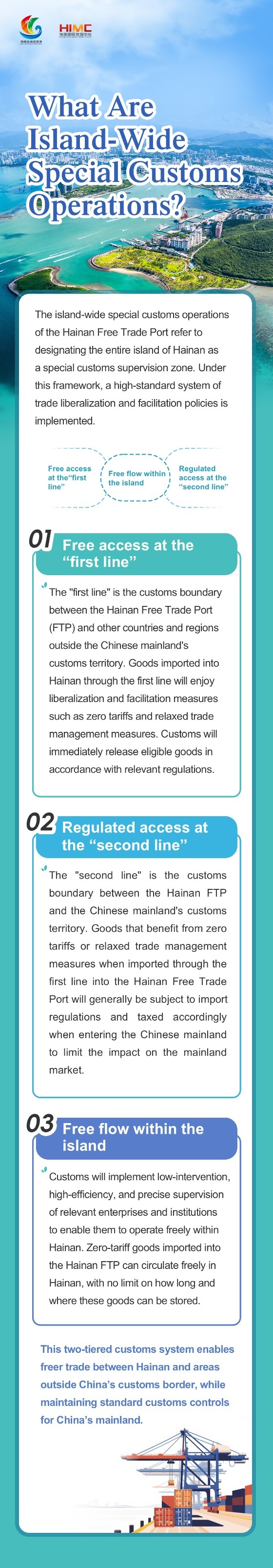The launch of island-wide special customs operations marks a new phase in the opening-up and development of Hainan FTP and the start of a long-term project that requires steady and continuous efforts. The following series of posters provide a breakdown of the information, highlighting the key aspects and policies of special customs operations at this stage, as well as policy adjustments, measures to further expand opening-up, and the future development outlook.