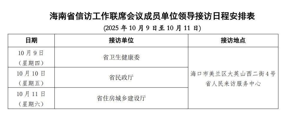 10月9日至11日,省卫生健康委、省民政厅、省住房城乡建设厅相关负责人将在海南省海口市美兰区大英山西二街4号省人民来访服务中心接访群众。具体日程安排如下表。