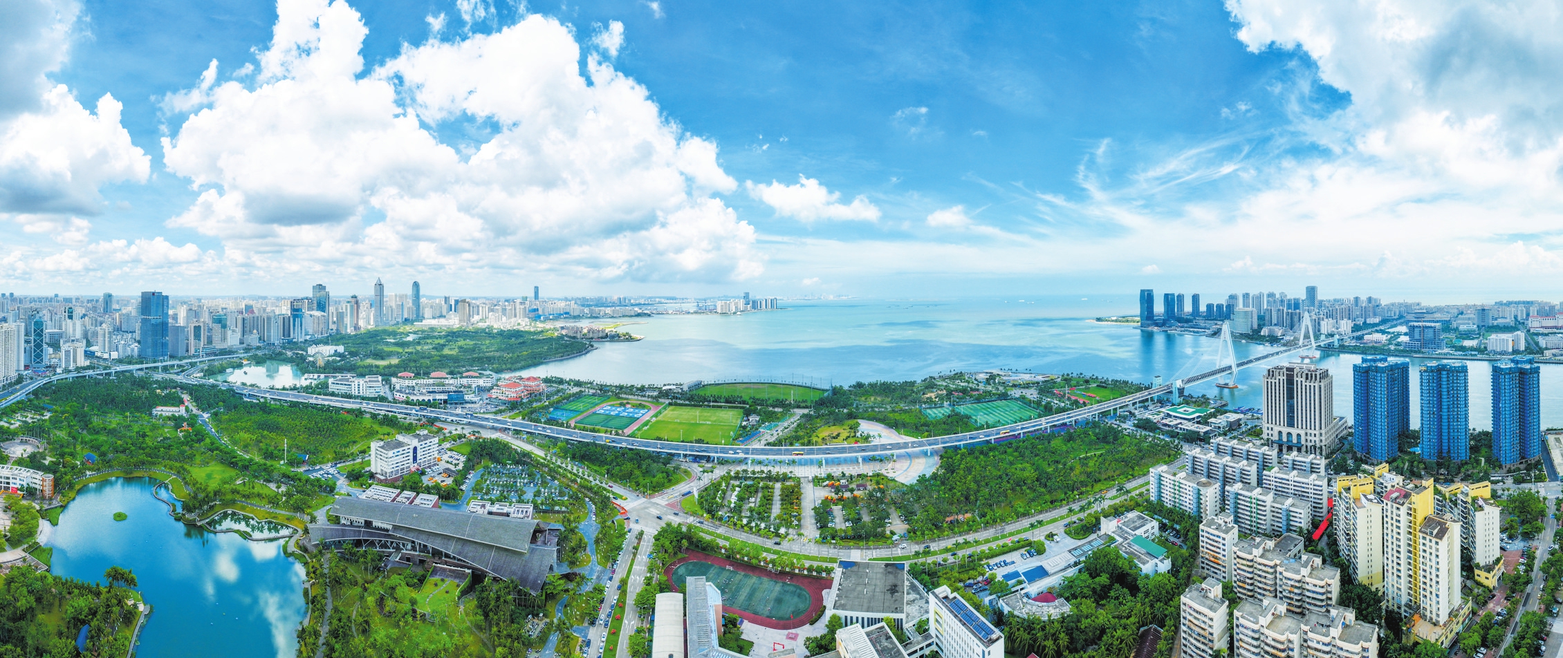 俯瞰海口湾一带,碧海蓝天,生机盎然,一幅人与自然和谐共生的绿色画卷。海口日报记者 杨鹤 摄