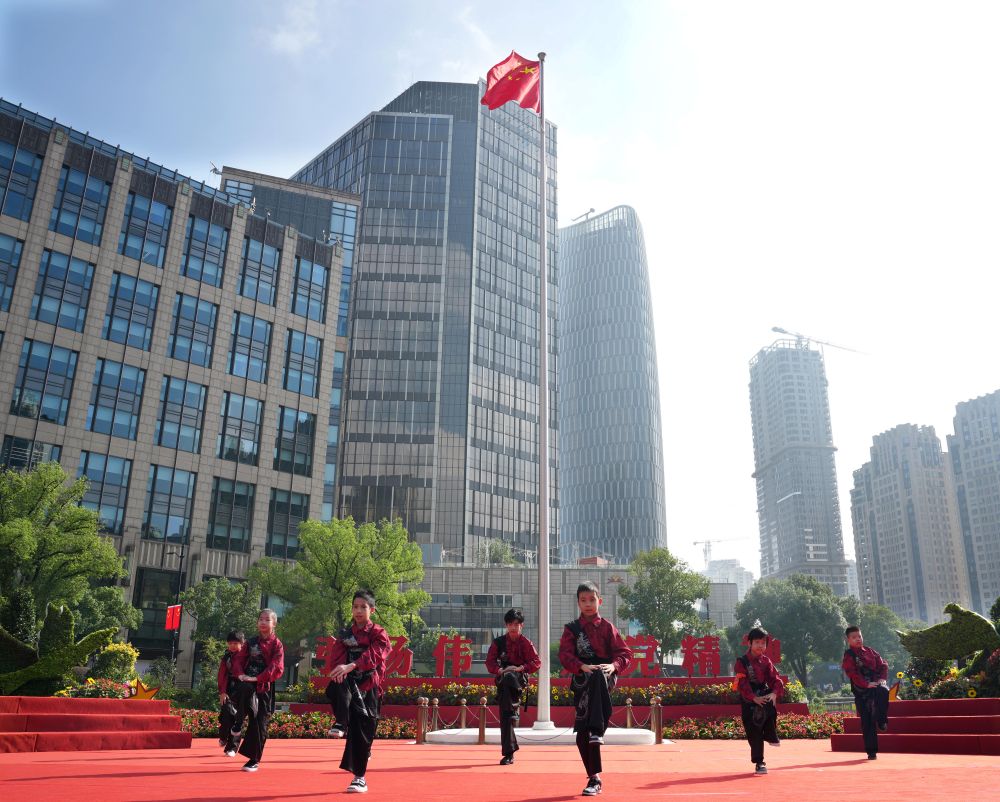 10月1日,在上海中共一大纪念馆前举行的文艺演出中,小朋友在表演舞蹈《男儿当自强》。新华社记者 刘颖 摄