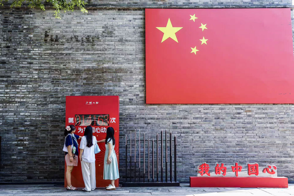 10月1日,在浙江嘉兴市南湖区建设街道子城城墙边,市民参加我为祖国心动打卡活动。新华社记者 徐昱 摄