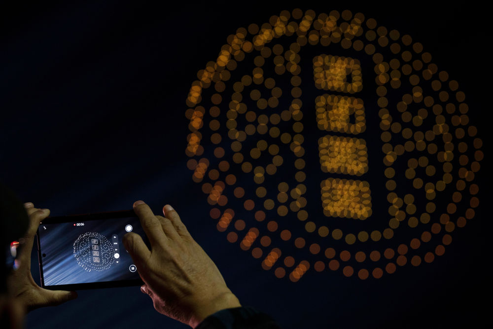 10月6日,游客在黑龙江哈尔滨冰雪大世界园区拍摄无人机表演。新华社记者 张涛 摄