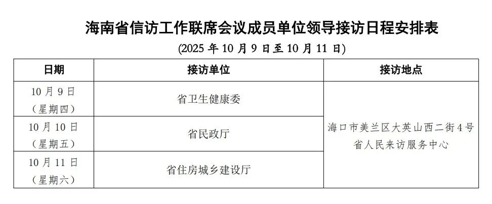 10月9日至10月11日海南省直属单位领导接访日程公布。(来源:新海南客户端)