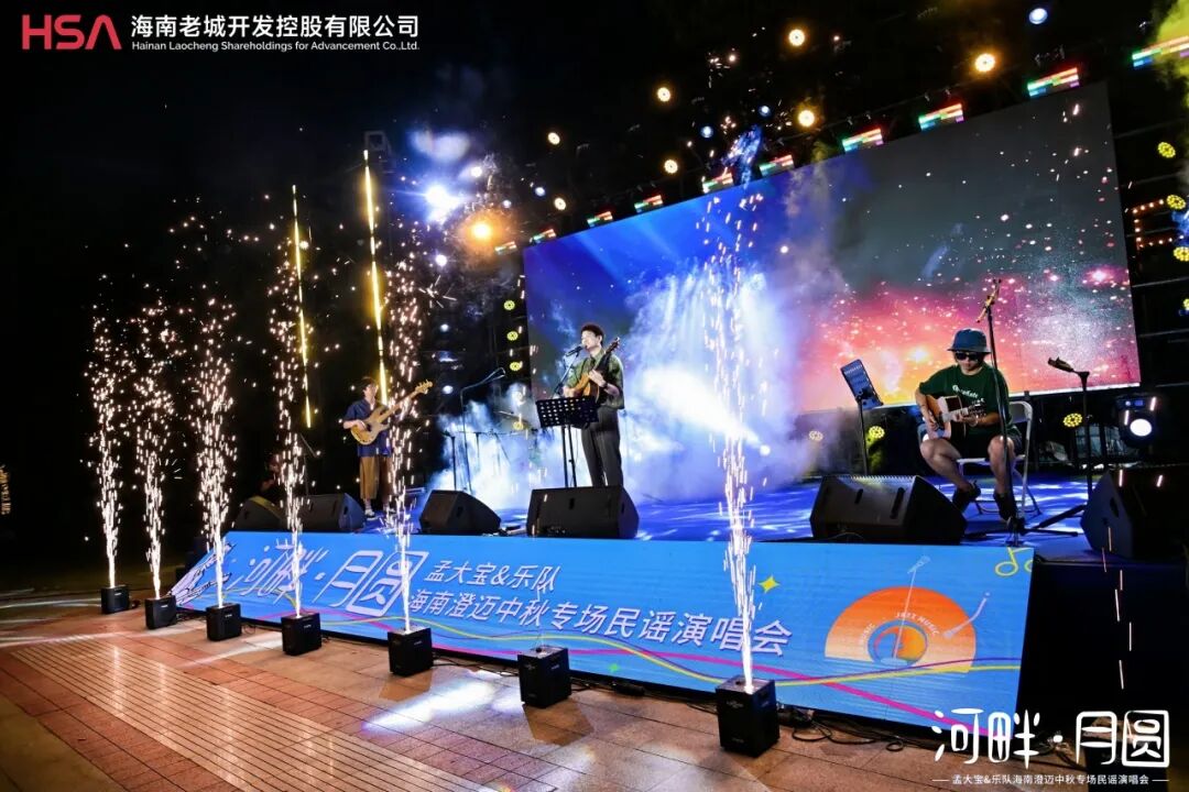 紧随其后,10月7日晚,“青澄里”商业街再度迎来高光时刻——《河畔·月圆》中秋专场民谣音乐会倾情上演,为接近尾声的“双节”假期画上了圆满的句号。知名音乐人孟大宝及其乐队空降澄迈,以温暖质朴的嗓音和深情演绎,为现场观众呈现了两大组经典民谣曲目。