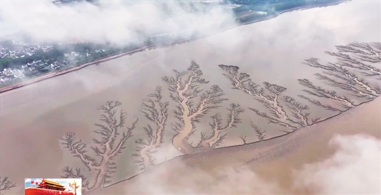 钱塘江大潮形成的潮汐树。(来源:央视新闻)