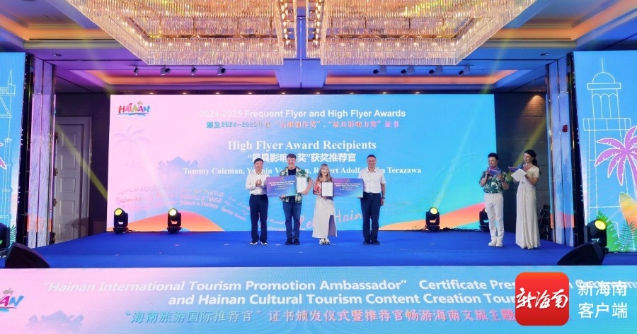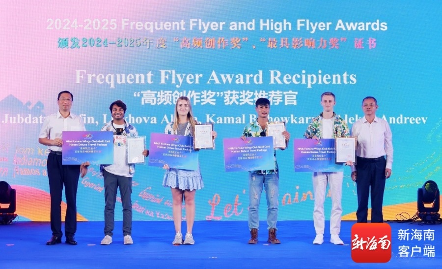 活动现场对2024-2025年度在海外社交平台积极宣传海南旅游的一批优秀国际推荐官进行了表彰。阿飞(Jubdatul Arefin)、爱丽(Liakhova Albina)、梁星(Kamal Bishowkarma)、艾力克斯(Aleksei Andreev) 等4位推荐官获“高频创作奖”;托米(Tommy Coleman)、荣茉莉(Yasmin Von Roon)、包子(Robert Adolf)、知香(Chika Terazawa)等4位推荐官获“最具影响力奖”。