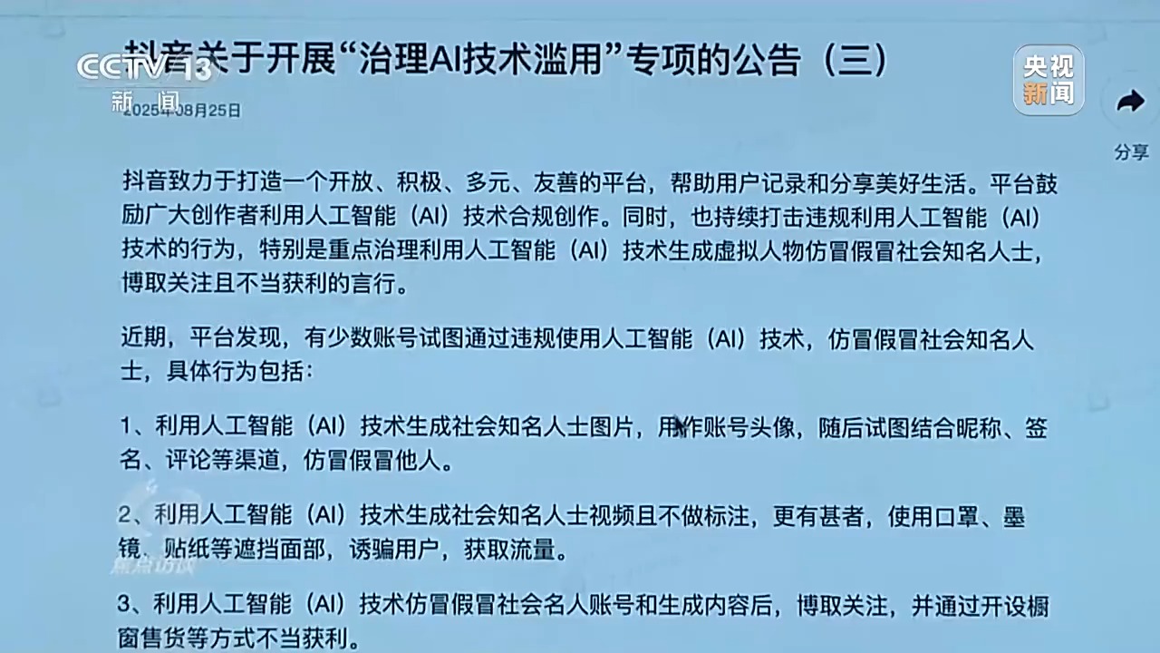 当下,在短视频平台或者是直播平台上购物成了很多人的新选择。刷视频的时候,还经常会冒出熟悉的明星,用流利的乡音推销农产品,有的还进行直播带货。这些所谓的明星很可能是仿冒的。近段时间,网络上一些商家利用AI技术仿冒带货。有的借助名人效应,仿冒专家学者、奥运冠军、影视明星;也有的借助产地效应,冒充知名品牌。消费者、粉丝难辨真伪,慕名下单,却不知道自己被蒙了。这些游走在灰色地带的“AI李鬼”,正拷问着我们的数字治理能力。