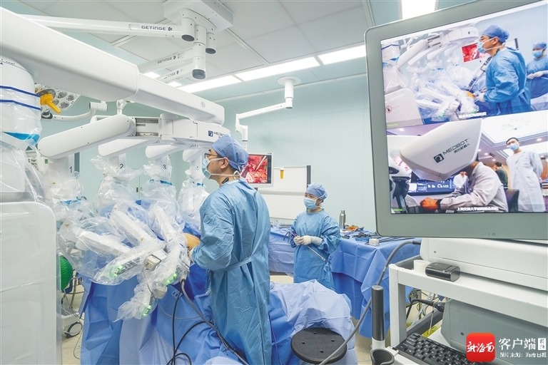 上海瑞金医院专家远程操控海南医院的手术机器人,为患者切除胰体尾。图为瑞金海南医院手术室现场。海南日报全媒体记者 袁琛 摄