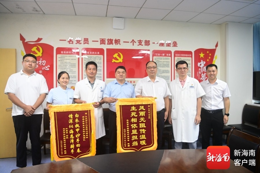 当日,三亚市外卖配送行业联合支部书记王冬冬与三亚市委社会工作部人员一行,将一面鲜红的锦旗郑重交到邓镇生手中。锦旗上,“白衣执甲妙手回春,情深似海恩泽骑手”十六个金黄大字,沉淀着一段通宵达旦的生命守护,也诉说着一个行业最崇高的敬意。