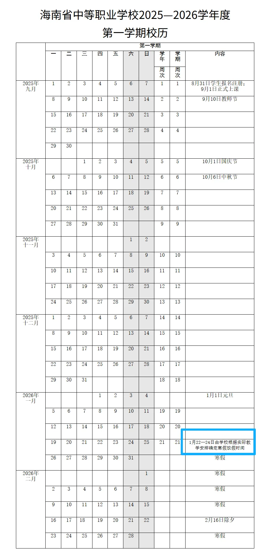 寒假开始时间:2026年1月22日至24日(由学校根据实际教学安排确定寒假放假时间)