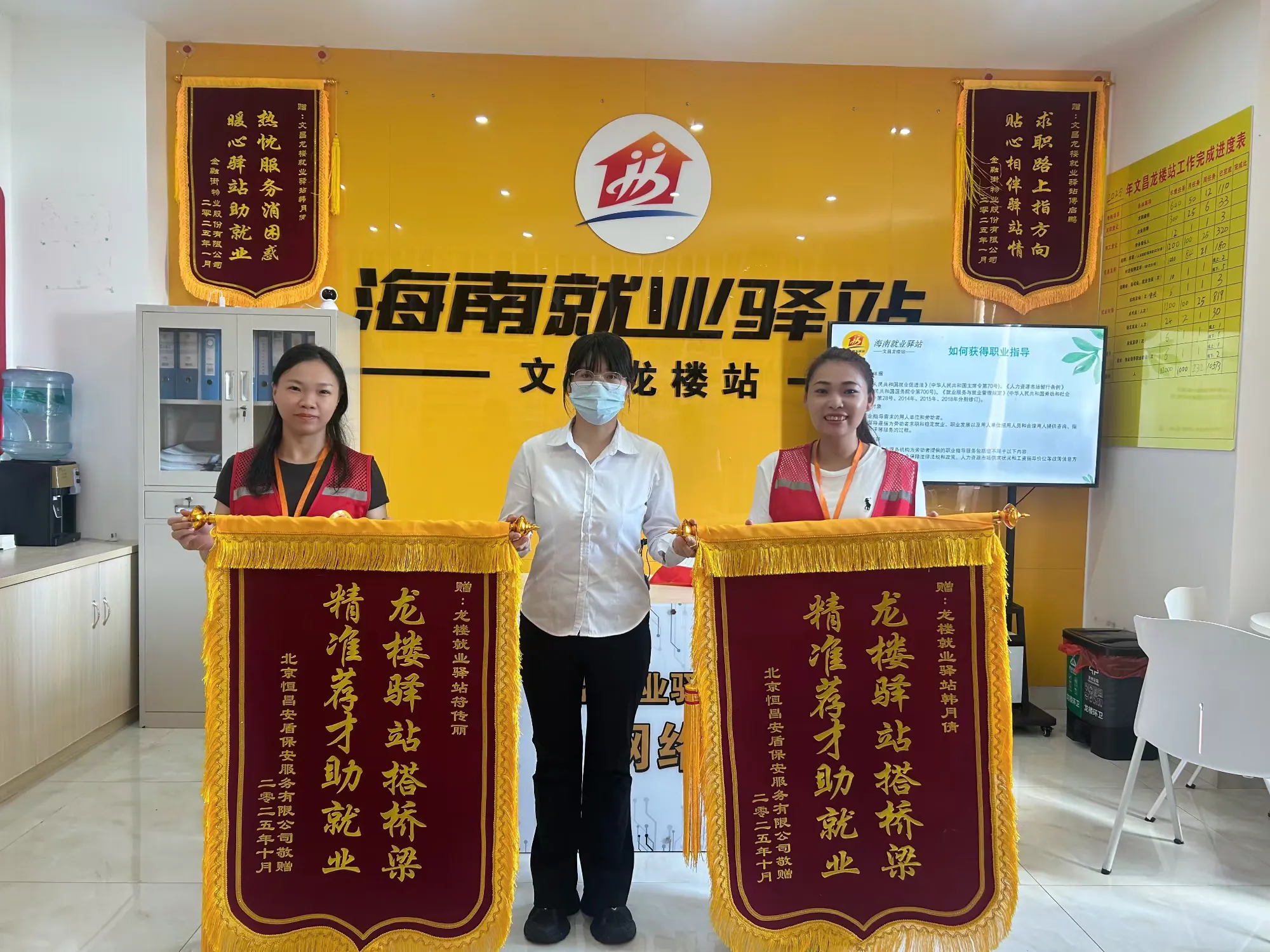 “龙楼驿站搭桥梁,精准荐才助就业”,近日,北京恒昌安盾保安服务有限公司将两面印着暖心话语的锦旗送到海南就业驿站文昌龙楼站工作人员手中,以感谢驿站在2025年为公司精准推荐6名求职者,成功入职龙楼镇淇水湾壹号小区安保岗位,解了企业的燃眉之急。