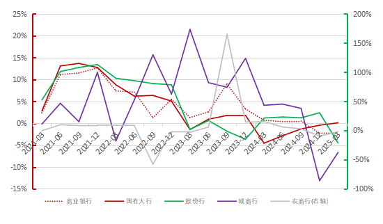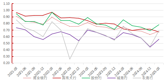 净利润增速整体延续下滑态势。金监总局官网数据显示,2025年一季度国内商业银行净利润同比下降2.32%,较2024年同期增速降低2.98个百分点;分机构类型看,国有大行净利润增速回正,国有大行净利润同比增长0.08%,较2024年同期增加4.65个百分点;股份行、城商行、农商行净利润增速均为负,同比增速分别为-4.53%、-6.68%、-2.03%,较2024年同期增速分别降低5.7、10.76、17.62个百分点,预计主要受其他非息收入波动较大的影响;城商行和农商行净利润降幅较2024年有所收窄,增速较2024年底分别提升6.45和7.72个百分点。