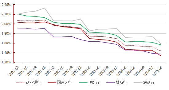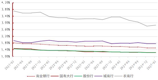 净息差续创新低,但降幅有所收窄。2025年一季度商业银行净息差为1.43%,较上年末下降9bp。资产端,主要受LPR下调,存量房贷利率年初重新定价,叠加有效信贷需求不足,年初以来部分银行消费贷“以价换量”影响,导致贷款等生息资产收益率明显下降。负债端,尽管2024年主要银行存款挂牌利率下调,但存款定期化趋势延缓负债成本下降。分机构类型来看,国有大行、股份行、城商行、农商行净息差分别为1.33%、1.56%、1.37%、1.58%,分别较上年收窄11、5、1、15bp。