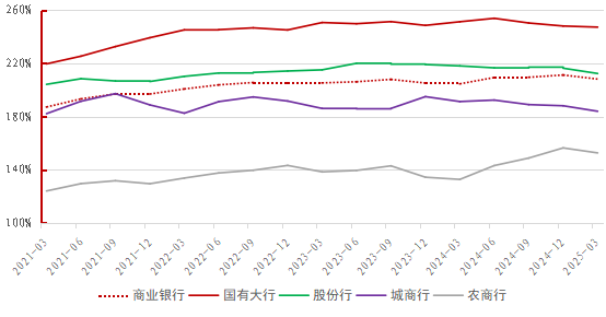 2025年一季度末,商业银行拨备覆盖率208.1%,同比上升3.6个百分点;贷款损失准备余额同比增长3.86%;贷款拨备率同比降低0.11个百分点。分机构类型看,国有大行、股份行、城商行、农商行拨备覆盖率分别为247.2%、212.3%、183.9%、152.6%,同比分别变化-4.0、-5.7、-7.3、19.9个百分点。农商行拨备覆盖率上升幅度较大,主要系2024年以来持续加大不良资产处置力度,不良贷款余额同比大幅下降9.03%。从2025年一季报数据看,18家国有和股份制银行中,仅交行和浦发拨备覆盖率同比上升;邮储、招行、平安、兴业等拨备覆盖水平较高的银行,一季度同比降幅均超10个百分点,邮储更是同比下降超60个百分点,反映在经济弱复苏环境下,部分银行通过少提拨备“以丰补歉”保持利润稳定释放。