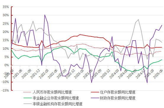 存款增速稳中有升。上半年末银行业金融机构人民币存款余额同比增长8.30%,增速较上年底上升2.0个百分点,整体趋势稳中有升。分结构看,住户存款、非金融企业存款、财政存款、非银行业金融机构存款同比增速分别为10.78%、3.29%、23.92%、13.67%,增速较上年底上升0.37、3.81、27.58、3.24个百分点,企业存款增速上升,与经济活跃度上升、去年同期整治手工补息导致低基数等因素相关;非银金融存款增速重回两位数与资本市场热度回暖有关。