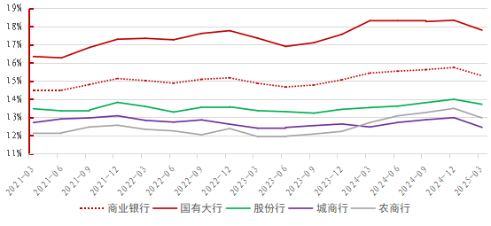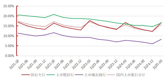资本充足率整体有所回落,股份行和农商行同比上升。2025年一季度末,商业银行资本充足率、一级资本充足率、核心一级资本充足率分别为15.28%、12.18%、10.70%,同比分别变化-0.15、-0.17、-0.07个百分点,自2024年初以来首次季度同比下降,一方面,一季度商业银行总资产同比增长7.12%,资产扩张速度超过了资本补充速度,从而拉低了资本充足率;另一方面,一季度商业银行净利润同比下降2.32%,而风险加权资产同比增长6.73%,利润增速放缓导致银行通过内部留存收益补充资本的能力减弱,影响了资本充足率。分机构类型来看,国有大行、股份行、城商行、农商行资本充足率分别为17.79%、13.71%、12.44%、12.96%,同比分别变化-0.52、0.18、-0.02、0.26个百分点。