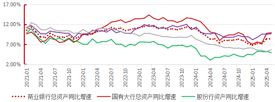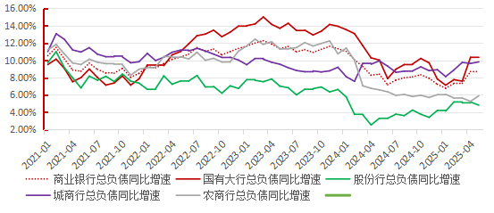 资产负债规模加速扩张,国有大行增势明显。在适度宽松货币政策导向、存贷款稳定增长以及金融投资上升等因素共同作用下,5月末商业银行境内总资产同比增长8.43%,增速较上年底上升1.23个百分点;总负债同比增长8.74%,增速较上年底上升1.52个百分点。分机构类型来看,国有大行、股份行、城商行、农商行总资产同比分别增长9.89%、4.89%、9.66%、5.64%,较上年底分别变化2.24、0.41、0.71、-0.42个百分点;总负债同比分别增长10.41%、4.81%、9.81%、5.89%,增速较上年底分别变化2.58、0.61、0.90、-0.13个百分点。国有大行增速回升明显,城商行继续维持较高增速;股份行和农商行增速低位平稳运行。