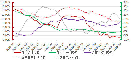 信贷总量持续增长,增速维持平稳。受地方专项债置换地方融资贷款平台影响,6月末银行业金融机构人民币贷款余额同比增长7.10%,增速较上年底降低0.5个百分点。分结构看,住户短期贷款、住户中长期贷款、企(事)业短期贷款、企(事)业中长期贷款、票据融资余额同比增速分别为1.17%、3.62%、8.77%、8.54%、14.58%,增速较上年底分别变化-1.15、-0.19、2.24、-1.62、2.64个百分点。住户短期及中长期贷款增速延续低迷,反映居民消费及住房需求仍然不足,信心有待修复;企(事)业中长期贷款维持高位,短期贷款增速明显回升,综合体现我国经济基本面长期稳中向好,但短期承压。