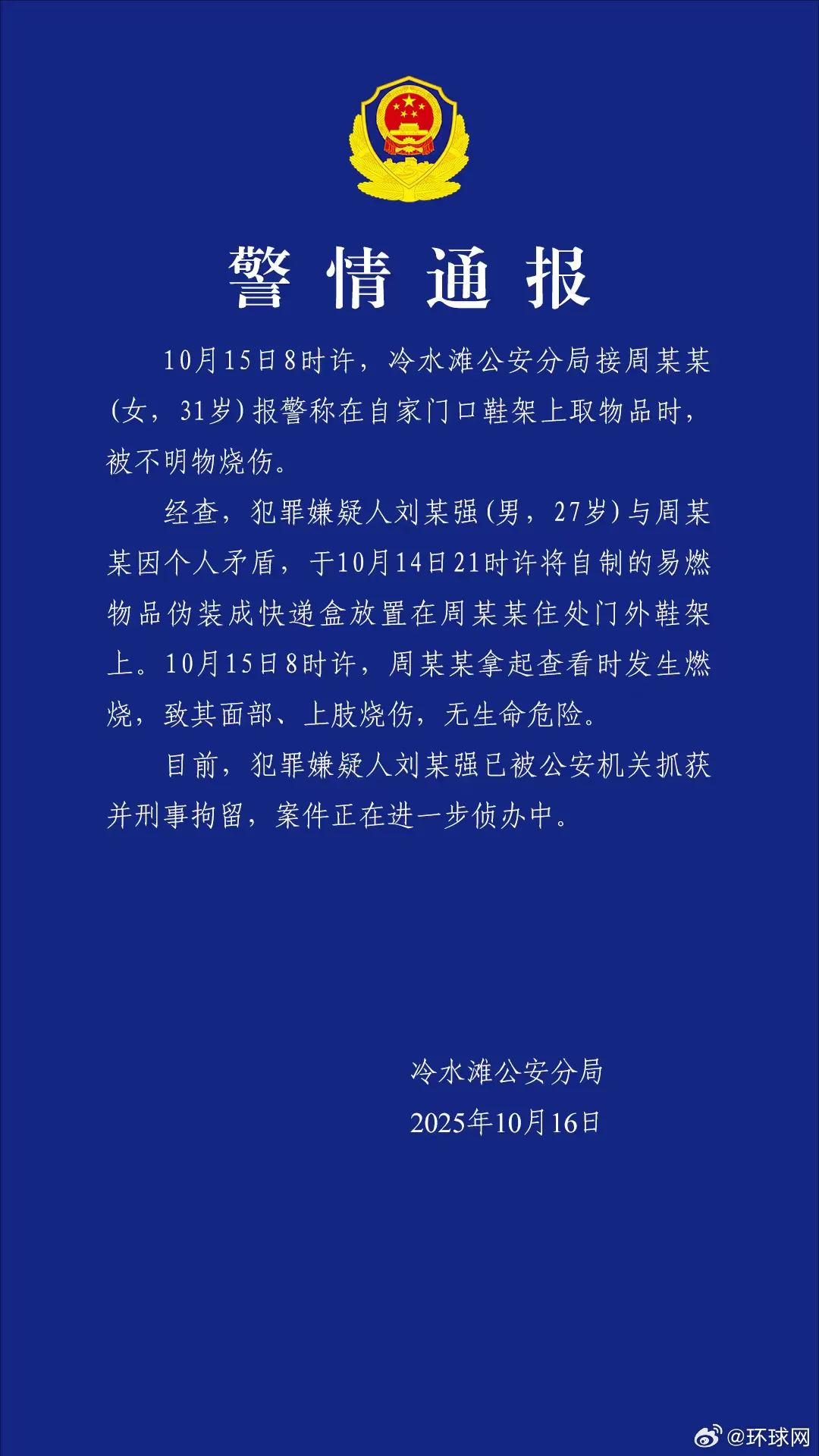 湖南省永州市公安局冷水滩分局发布警情通报:10月15日8时许,冷水滩公安分局接周某某(女,31岁)报警称在自家门口鞋架上取物品时,被不明物烧伤。经查,犯罪嫌疑人刘某强(男,27岁)与周某某因个人矛盾,于10月14日21时许将自制的易燃物品伪装成快递盒放置在周某某住处门外鞋架。10月15日8时许,周某某拿起查看时发生燃烧,致其面部、上肢烧伤,无生命危险。目前,犯罪嫌疑人刘某强已被公安机关抓获并刑事拘留,案件正在进一步侦办中。