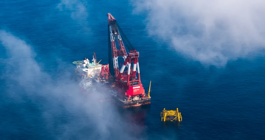 高达161.6米的文昌16-2平台导管架,精准就位碧海之中。海南日报全媒体记者 王凯 袁琛 通讯员 吴盛龙 汪洋 刘聪 摄