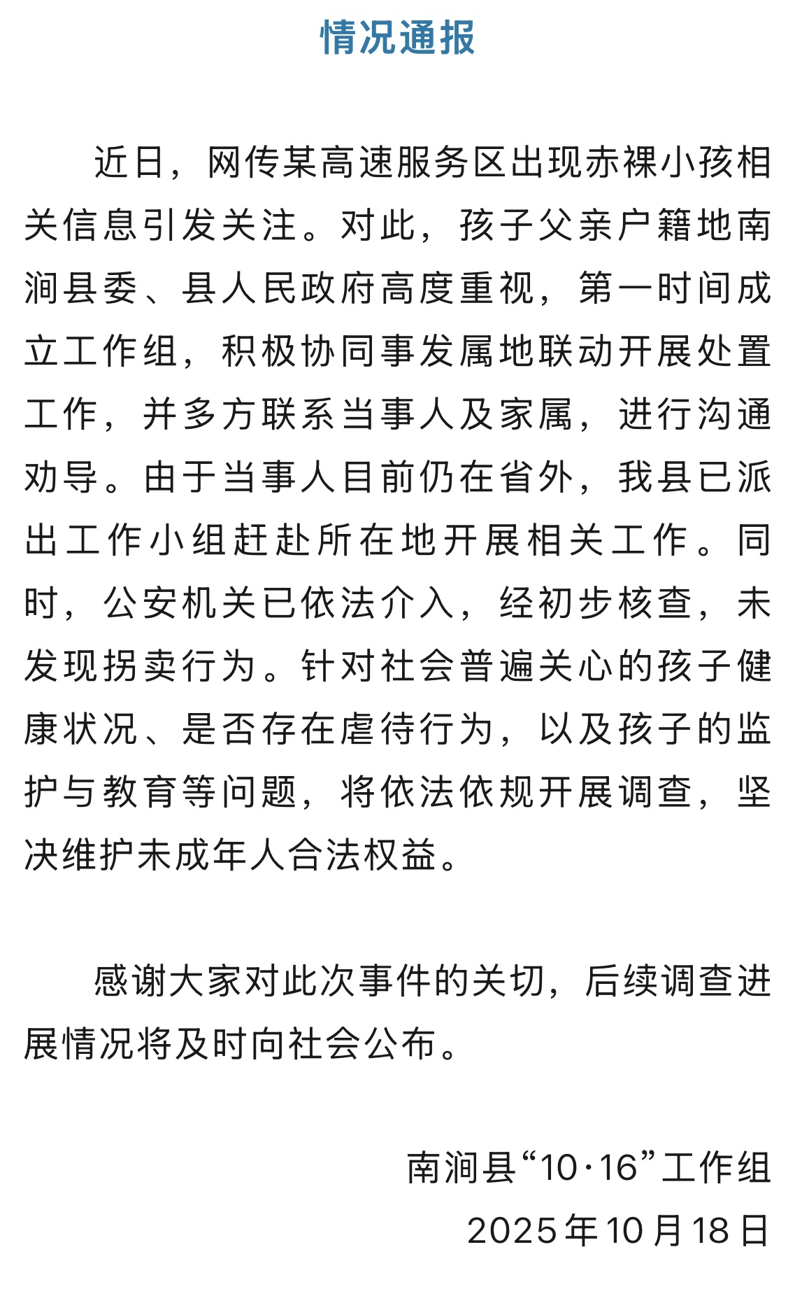 近日,网传某高速服务区出现赤裸小孩相关信息引发关注。对此,孩子父亲户籍地南涧县委、县人民政府高度重视,第一时间成立工作组,积极协同事发属地联动开展处置工作,并多方联系当事人及家属,进行沟通劝导。由于当事人目前仍在省外,我县已派出工作小组赶赴所在地开展相关工作。同时,公安机关已依法介入,经初步核查,未发现拐卖行为。针对社会普遍关心的孩子健康状况、是否存在虐待行为,以及孩子的监护与教育等问题,将依法依规开展调查,坚决维护未成年人合法权益。