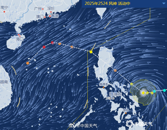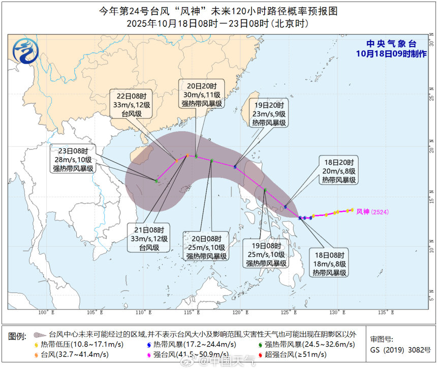 今年第24号台风“风神”(热带风暴级)14时其中心位于北纬13.0度、东经125.2度,也就是在菲律宾马尼拉东偏南方向约490公里的海面上,中心附近最大风力8级(18米/秒)。预计,“风神”将以每小时20-25公里的速度向西北方向移动,19日白天将在菲律宾吕宋岛东部沿海登陆,19日下午到夜间进入南海东部海面,强度逐渐加强,最强可达强热带风暴级或台风级(11-12级),并向海南岛东南部海面靠近,尔后强度逐渐减弱。