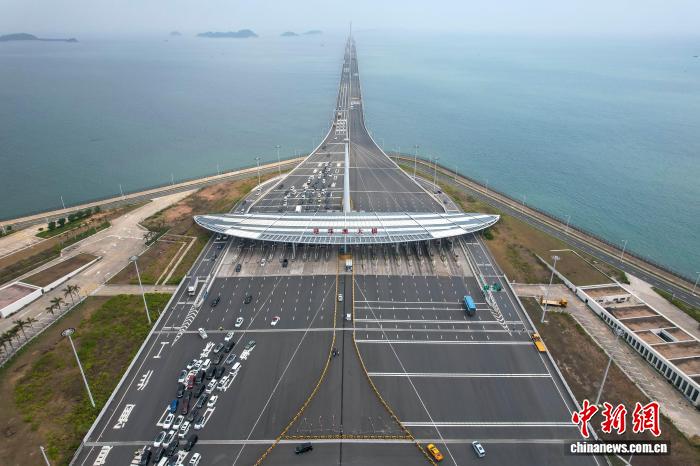 2024年3月30日,广东珠海,港澳车辆经港珠澳大桥珠海公路口岸入境。(无人机照片) 中新社记者 陈骥旻 摄