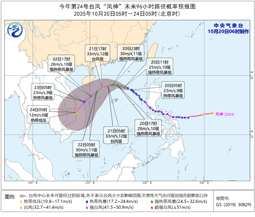 今年第24号台风“风神”(热带风暴级),10月20日05时其中心位于北纬17.6度、东经117.2度,也就是在海南省三沙市(西沙永兴岛)偏东方向约520公里的海面上,中心附近最大风力9级(23米/秒)。预计,“风神”将以每小时25公里左右的速度向西偏北方向移动,强度逐渐加强,最强可达强热带风暴级或台风级(30-35米/秒,11-12级),并向海南岛东南部海面靠近,尔后强度逐渐减弱。