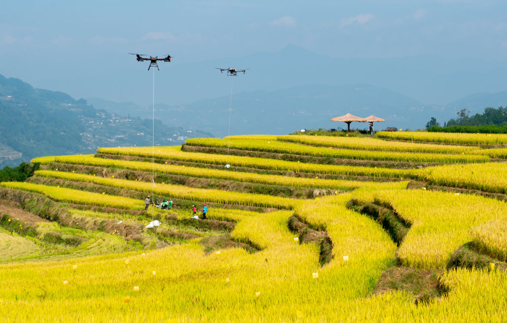 10月10日,湖北省秭归县沙镇溪镇长春村村民用无人机转运收获的水稻(无人机照片)。新华社发(雷勇摄)