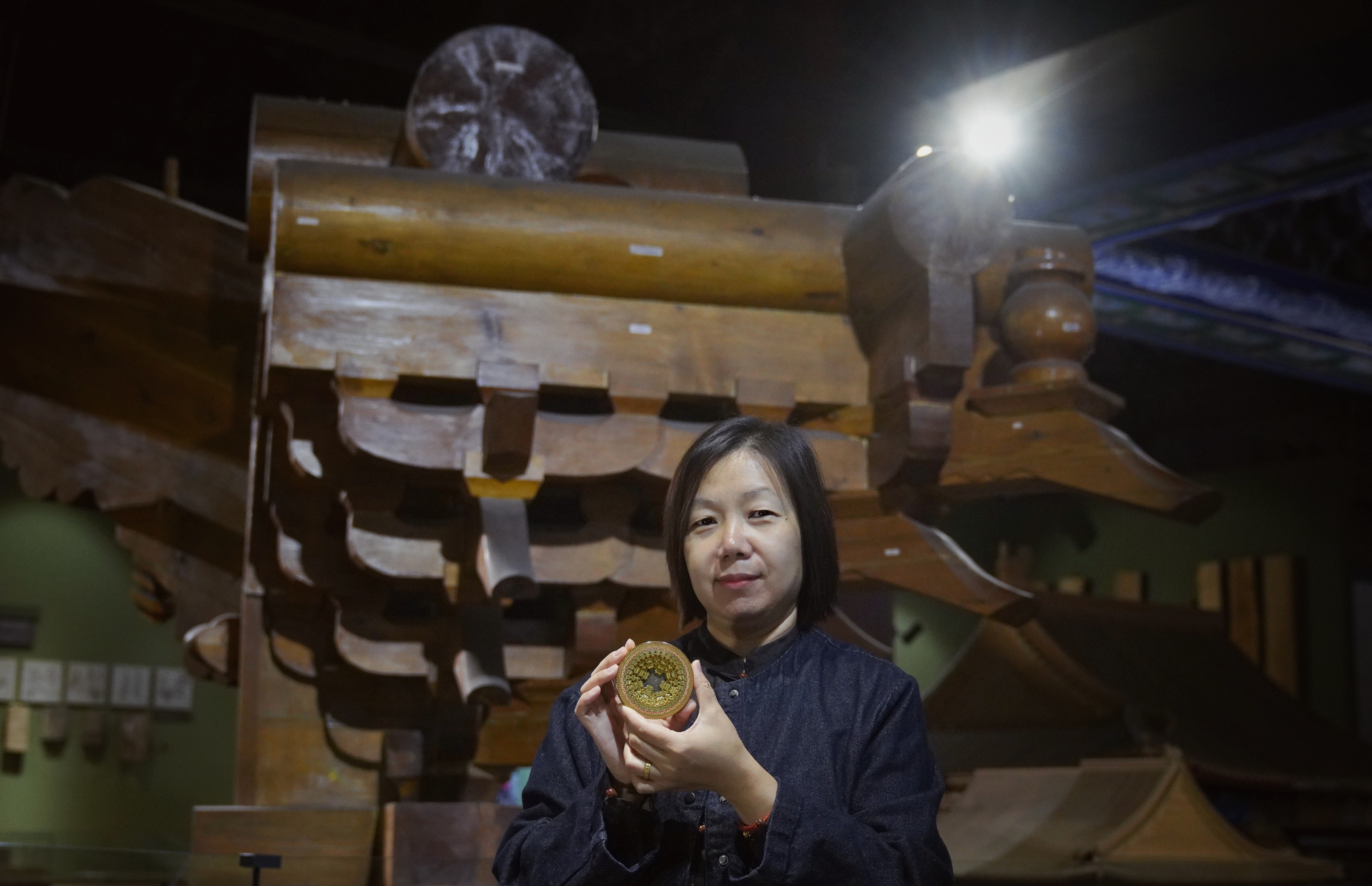 北京古代建筑博物馆游览文物保护与发展部高级工艺美术师周海荣展示天宫藻井冰箱贴。新京报记者 薛珺 摄