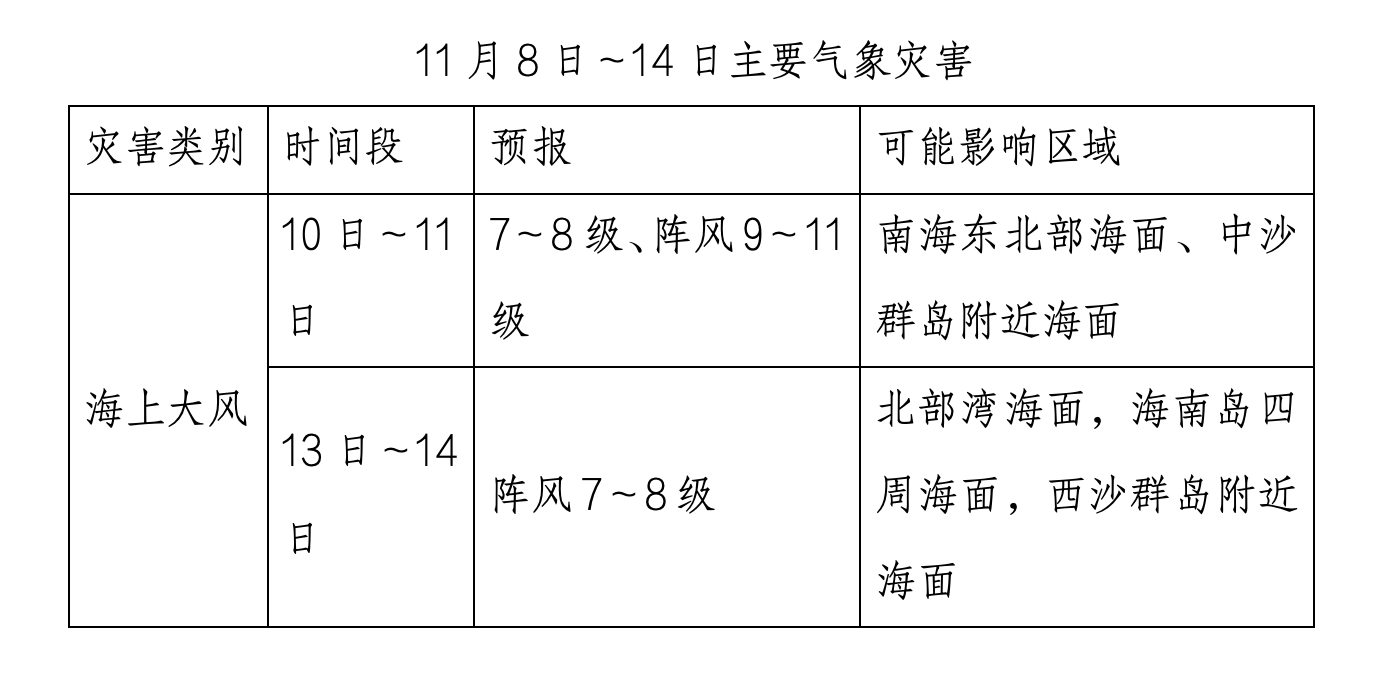 海洋方面:11月8日~9日,北部湾海面,海南岛四周海面,西沙、中沙和南沙群岛附近海面,风力5级、阵风6~7级。
