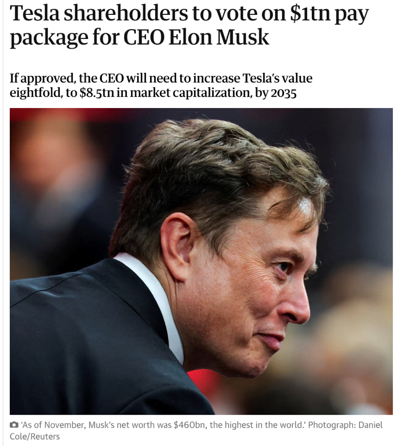 △《卫报》报道,如马斯克薪酬方案获特斯拉股东大会批准,他将可能成为首位万亿富翁