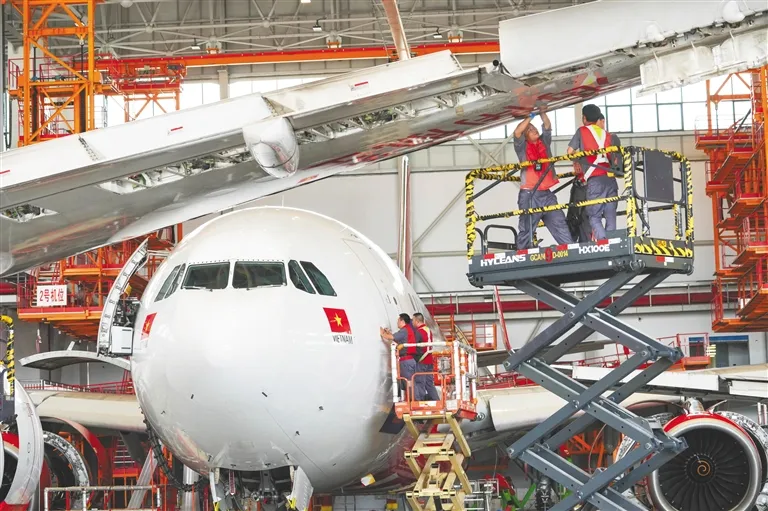 “这架来自约旦,那两架来自越南……维修计划排到了2026年底。”海航技术大新华飞维空港维修基地总监古志林介绍,自2022年投用以来,一站式飞机维修产业基地完成超2400架次飞机维修,服务近50家国内外航空公司。